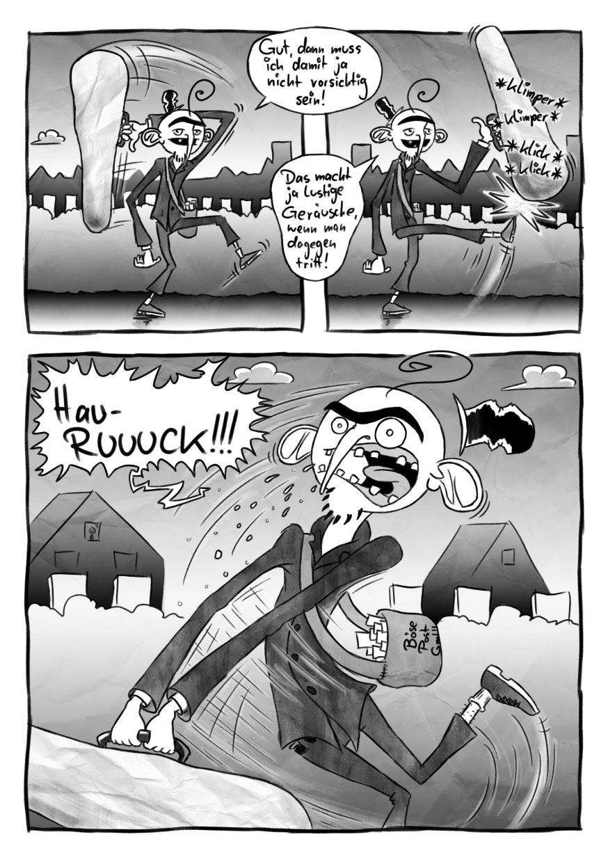 Kurz und intensiv – dieses Heft beinhaltet 36 schwarzweisse Innenseiten, die abwechslungsreicher nicht sein könnten. Steffen Wittig hat mit seinem markanten Zeichenstil kein Panel zuviel gefüllt, so dass Sie ihre Augen nicht unnötig benutzen müssen. Wir empfehlen, dieses Heft auf dem Gästeklo zu platzieren und immer an der Tür zu lauschen, um sich an dem glockenhellen Lachen ihrer Gäste zu erfreuen!