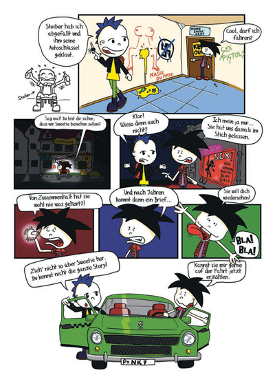 Punks'n'Banters – Punkrock Lovedrug 1 Autor/Zeichner: DonAlD Mit Punks'n'Banters – Punkrock Lovedrug beginnt die chaotische Reise der Punks Bastard, Coffee und Co. Nachdem Bastard von seiner damaligen besten Freundin Sweetie einen Brief erhält, fährt er quer durch das Land um sie zu besuchen. Mit an Bord ist der exzessiv lebende Coffee. Der Skinhead Stoiber und der Punk Jack – Mitbewohner von Bastard und Coffee – beschließen aus Langeweile ihnen hinterher zu reisen. Sex, Drugs, Assi & Punk bestimmen diesen Comic! Dabei werden keine Punkstereotypen ausgelassen und dennoch findet man einen gewissen Ernst in der Geschichte. |